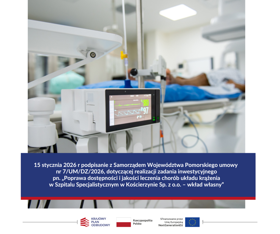Szpital Specjalistyczny w Kościerzynie sp. z o.o. podpisał z Samorządem Województwa Pomorskiego umowę nr 7/UM/DZ/2026 z dnia 15 stycznia 2026 r. na udzielenie dotacji celowej w wysokości 3 366 199 zł. Środki te zostaną przeznaczone na pokrycie kosztów niekwalifikowanych projektu, w tym podatku VAT, w ramach realizacji zadania inwestycyjnego pn. „Poprawa dostępności i jakości leczenia chorób układu krążenia w Szpitalu Specjalistycznym w Kościerzynie Sp. z o.o. – wkład własny”. Pozostała, zasadnicza część inwestycji, obejmująca koszty kwalifikowane w wysokości 20 mln zł, finansowana jest ze środków Krajowego Planu Odbudowy i Zwiększania Odporności. Łączna wartość przedsięwzięcia w 2026 roku wynosi 23 366 199 zł.